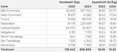 Kvantumet fersklevert hyse i uke 4 var 820 tonn til verdi 11,5 millioner kroner. En økning fra 750 tonn/10,6 millioner kroner uken før. Størst aktivitet i Øst-Finnmark med 330 tonn av totalen, hvorav 280 tonn er tatt med line/autoline. Deretter følger Vesterålen med 230 tonn av totalen, hvorav line/autoline stod for 140 tonn av totalen. I Troms var det levert 100 tonn, hvorav 54 tonn kom fra line/autoline. Lofoten/Salten står for 90 tonn, hvorav 63 tonn kom fra line/autoline. Vest-Finnmark er neste ut, med 42 tonn, her var 23 tonn tatt på line/autoline. Kvanta under 10 tonn i resterende soner.