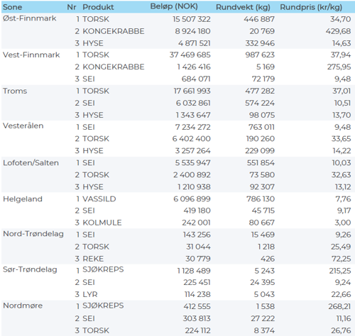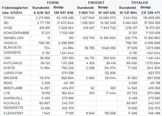 Omsetningen av ferskt råstoff i uke 4 utgjorde 140 millioner kroner, ned fra 155 millioner kroner i uke 3. Torsk, sei, hyse og kongekrabbe var størst i verdi med henholdsvis 82, 22, 12 og 11 millioner kroner, og for øvrig slik det framgår av tabell 1.