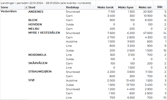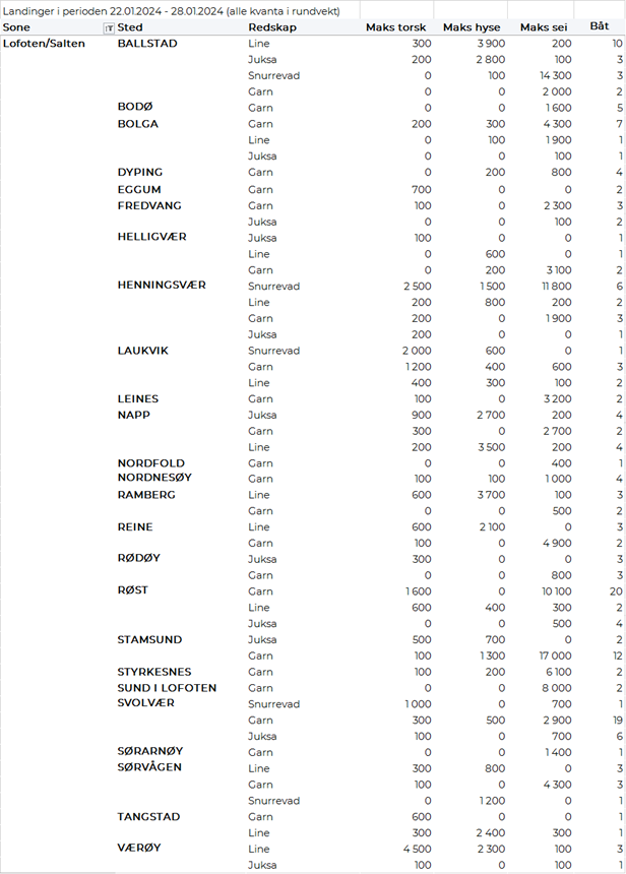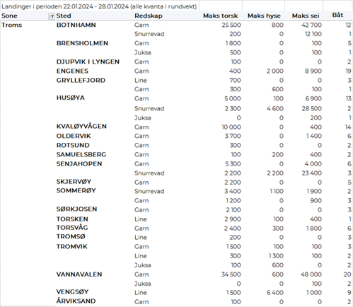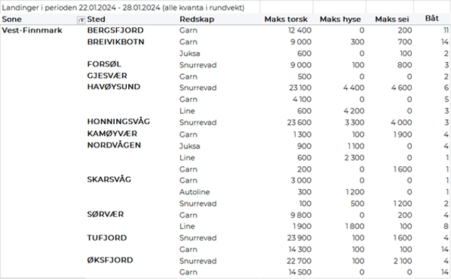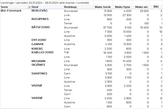 Omsetningen av fersk torsk utgjorde 2.210 tonn til verdi 82 millioner kroner, som var ned fra 2.360 tonn og 85 millioner kroner i uke 3. 1.250 tonn var tatt på garn, snurrevad stod for 660 tonn, line/autoline for 250 tonn, og mindre kvanta var tatt på trål og juksa. 670 tonn av garntorsken var levert i Vest-Finnmark, 430 i Troms og 90 tonn i Vesterålen. Nær halvparten av snurrevadtorsken, 320 tonn, var omsatt til kjøpere i Vest-Finnmark. 230 tonn var levert i Øst-Finnmark, ellers spredt. Også linetorsken var i hovedsak levert i Øst-Finnmark. Av totalen var dermed 1.000 tonn levert i Vest-Finnmark, 480 tonn i Troms, 450 tonn i Øst-Finnmark, 190 tonn i Vesterålen og 70 tonn i Lofoten. Fremdeles mest sei i fangstene fra Troms til Lofoten, der garnbåtene drifter med seigarn.