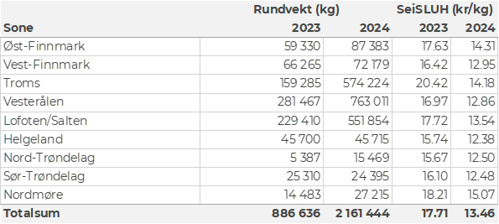 Omsetningen av fersk sei i uke 4 utgjorde 2.170 tonn til en verdi av 22 millioner kroner, litt ned fra 2.450 tonn/24 millioner kroner uken før. I likhet med torsken tas det meste av seien på garn som står for 1.360 tonn av totalen. Deretter følger snurrevad med 720 tonn, juksa med 40 tonn og lina med 30 tonn. Geografisk fordeling viser størst leveranser til Vesterålen med 760 tonn av totalen, etterfulgt av Troms med 570 tonn, 550 tonn var levert i Lofoten/Salten, 90 tonn i Øst-Finnmark, 70 tonn i Vest-Finnmark, 50 tonn på Helgeland og 70 tonn i området Trøndelag/Nordmøre.