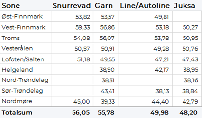 Tabell 2 og 3 viser fordelingen av landingene av fersk torsk pr leveringssone og redskap (unntatt trål), med tilhørende snittpriser. De to tabellene er basert på omsetning av kvalitet A og ekstra, der alle leveringstilstander inngår, men der snittprisene er omregnet til sløyd uten hode-priser, eksklusiv restråstoff.