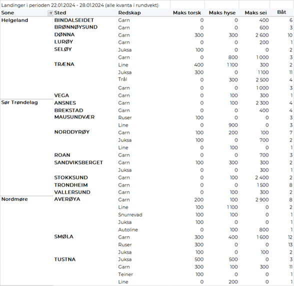 Fiskeriaktiviteten og fiskemønstret til kystflåten i uke fire var stort sett uforandret fra uka før. Det leveres mest sei i områdene fra Lofoten til Troms, mest torsk i Finnmark og hyse fra Lofoten til Finnmark. Mesteparten av seien og torsken fanges med garn mens hyse fiskes med line og autoline. Nyhet i fisknytt denne gangen er to tabeller som viser omsetning og snittpriser for fersk sei og hyse uke fire i år, sammenlignet med samme uke i fjor.