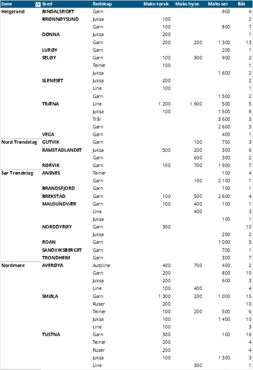 Hittil i år står garnfisket for 3.800 tonn av all fersk torsk, sammenliknet med samme periode i fjor som var på 2.171 tonn, hvor uke 4 i 2025 utgjorde 1.266 tonn av denne totalen. Mengden fra trål er redusert fra 114 tonn i uke 4 i 2025 til 76 tonn samme uke i 2026, samlet er det en reduksjon fra 645 tonn hittil i år i 2025 til 379 tonn hittil i år i 2026. Så langt i år er det landet 2.451 tonn fersk torsk i Vest-Finnmark, sammenlignet med samme periode i fjor som lå på 1.369 tonn, hvor garn står for nesten alt av fangsten. Troms ser en økning i samme periode fra 1.053 tonn til 1.547 tonn med en lik redskapsfordeling som Vest-Finnmark. Øst-Finnmark ser en nedgang fra 730 tonn til 632 tonn, mens Vesterålen ser en oppgang fra 576 tonn til 618 tonn, hvor garnfangsten har stått for mye av oppgangen sammenliknet med samme periode i fjor.