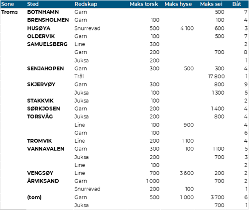 Tabell 2 og 3 viser fordelingen av landingene av fersk torsk per leveringssone og redskap (unntatt trål), med tilhørende snittpriser. De to tabellene er basert på omsetning av kvalitet A og ekstra, der alle leveringstilstander inngår, men der snittprisene er omregnet til sløyd uten hode-priser, eksklusivt restråstoff.