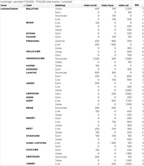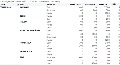 Det ble omsatt 84 tonn fersk kveite i uke 41 til verdi 3,9 millioner kroner. Fangstene fordeler seg i hovedsak på Vest-Finnmark med 24 tonn, Troms med 27 tonn og Lofoten med 16 tonn. Kvanta under 8 tonn i resterende soner. I Vest-Finnmark og Troms tas det meste på Line/Autoline, mens det er størst kvanta tatt på garn i Lofoten.