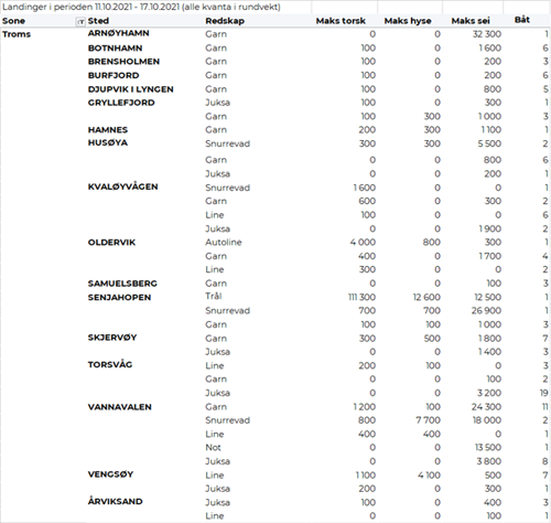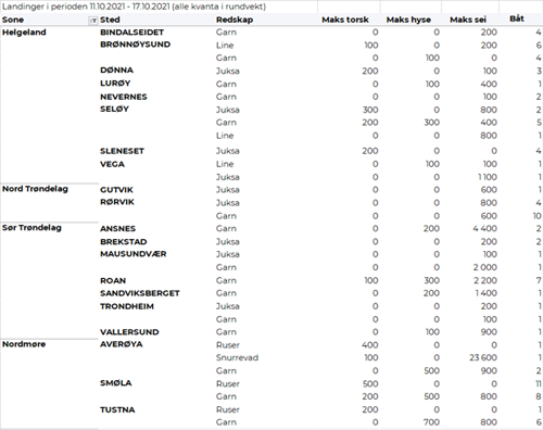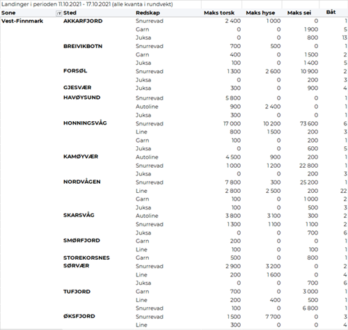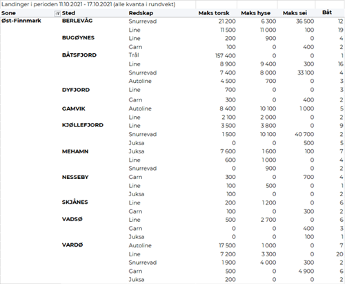 Ser vi på omsetningen av ferskt råstoff totalt for Råfisklagets distrikt, var torsken størst i verdi med 19,5 millioner kroner av et kvantum på 1.030 tonn. Dette var opp fra 775 tonn/14,6 millioner kroner uka før. Økinga kom først og fremst i Øst-Finnmark og spesielt på line/autoline. Kvantumet i uke 41 var fordelt med 430 tonn tatt på line/autoline, 320 tonn på trål, 210 tonn på snurrevad og mindre kvanta på garn og juksa. Den geografiske fordelinga var 630 tonn levert Øst-Finnmark, 160 tonn i Vest-Finnmark, 200 tonn i Troms og for øvrig labert. Av kvantumet levert Øst-Finnmark var 370 tonn tatt på line/autoline, mens en trålfangst utgjorde 160 tonn og 80 tonn var tatt på snurrevad. I Vest-Finnmark var redskapsfordelinga 110 tonn på snurrevad og 40 tonn på line/autoline. Kvantumet levert Troms kom i hovedsak fra en tråler som på to leveranser hadde 160 tonn torsk.