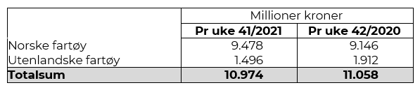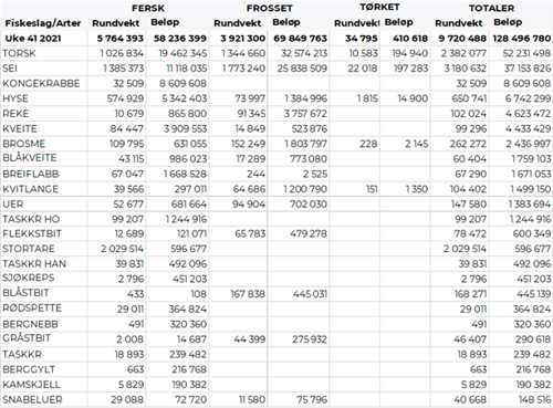 Tilsvarende uke i fjor, som var uke 42 (12.-18. oktober 2020) var omsetninga 166 millioner kroner, hvorav 16 millioner kroner kom etter landing fra utenlandske båter. Omsetningen for norske båter var 150 millioner kroner, fordelt med 71 på fersk og 79 på fryst.
