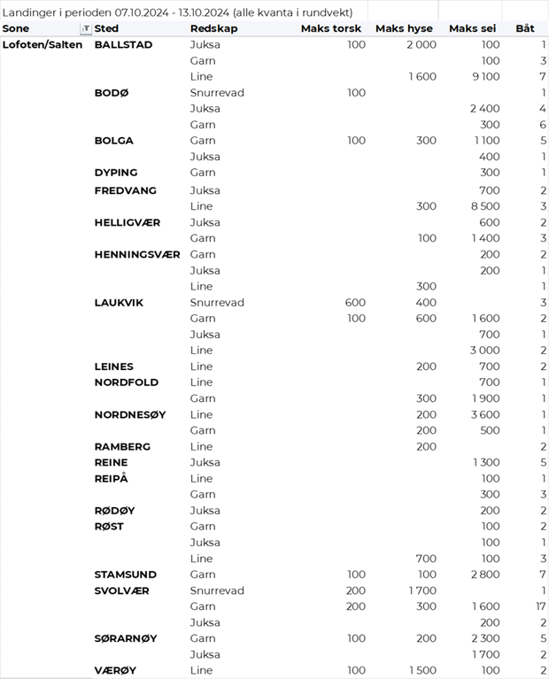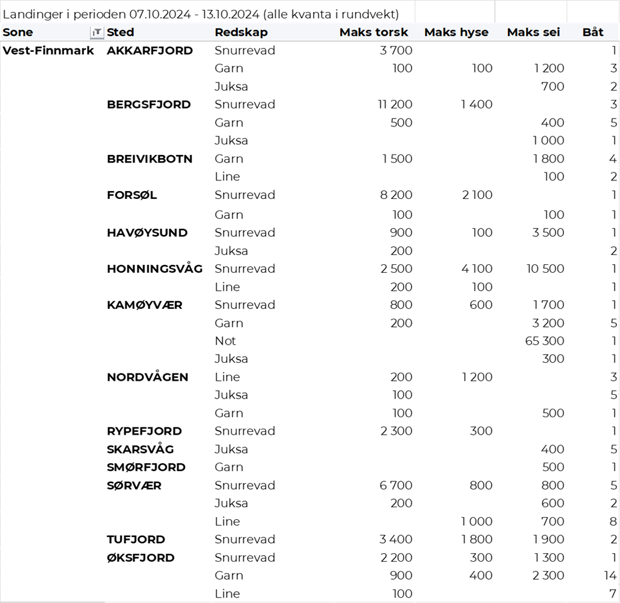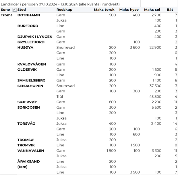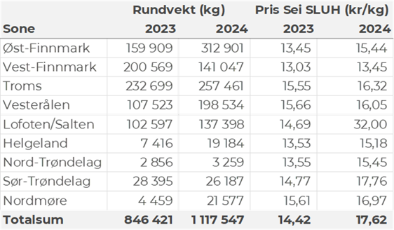 Omsetningen av fersk sei i uke 41 utgjorde 1.260 tonn til en verdi av 16,5 millioner kroner. Opp fra 710 tonn/7,7 millioner kroner uken før. Økningen kom først og fremst på snurrevad, som økte fra 125 til 600 tonn. 290 tonn var tatt på garn, 150 tonn på trål, 90 tonn på lina, og 65-70 tonn hver på juksa og not. Halve snurrevadkvantumet var levert i Øst-Finnmark, og resterende i hovedsak i Vesterålen og Troms. På garn var 100 tonn levert i Troms, ellers spredt. Trålkvantumet var levert av 4 Nergård-trålere til Senjahopen. Linekvantumet var i hovedsak levert i Lofoten. Notkvantumet kom fra en enkelt leveranse i Kamøyvær. Juksafisket var mer spredt, men med størst kvantum levert i Torsvåg. Den geografiske fordelingen av seileveransene unntatt trål framgår av tabell 4.