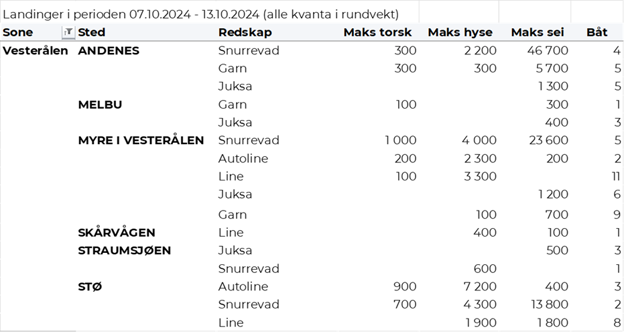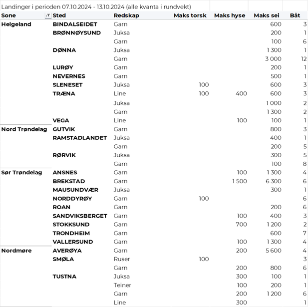 I uke 41 ble det omsatt 100 tonn fersk kveite til en fangstverdi av 6,1 millioner kroner, en tangering av uken før som hadde samme omsetning i tonn og verdi. Troms er største sone med 31 tonn, etterfulgt av Lofoten med 21 tonn, 20 tonn i Vest-Finnmark og kvanta fra 8 tonn og lavere i resterende soner.