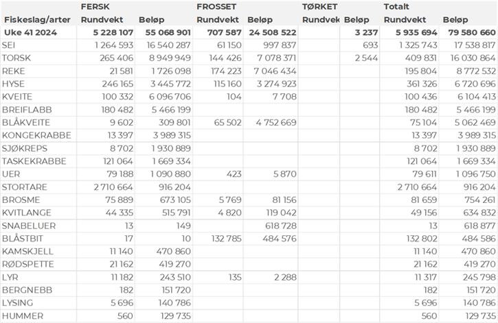 Omsetningsdata i denne rapporten skriver seg først og fremst fra uke 41. Alle kvanta i rapporten er oppgitt i tonn rundvekt, hvis ikke annet er presisert, og verdi i 1.000 kroner, evt. millioner kroner.