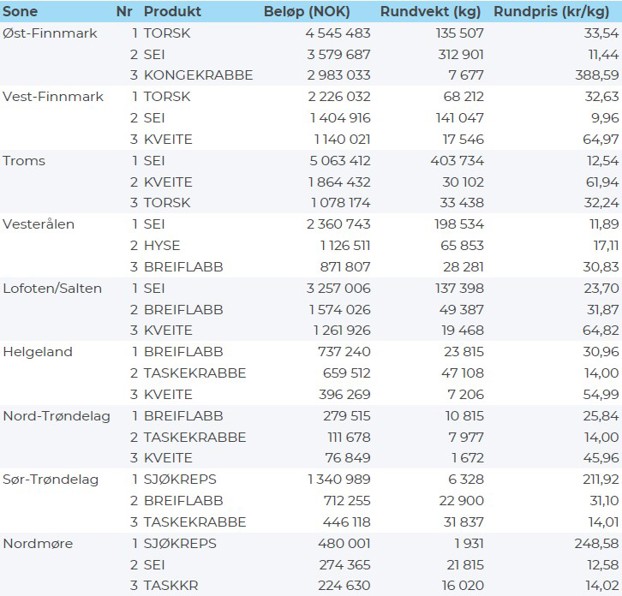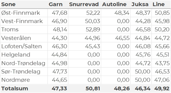 Tabell 2 og 3 viser fordelingen av landingene av fersk torsk pr leveringssone og redskap (unntatt trål), med tilhørende snittpriser. De to tabellene er basert på omsetning av kvalitet A og ekstra, der alle leveringstilstander inngår, men der snittprisene er omregnet til sløyd uten hode-priser, eksklusiv restråstoff.