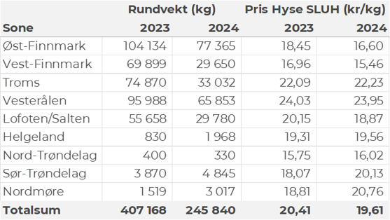 Kvantumet fersklevert hyse i uke 41 var 250 tonn til en verdi av 3,4 millioner kroner. Opp fra 160 tonn/2,3 millioner kroner uken før. Størst kvantum er tatt på line/autoline med 140 tonn av totalen, etterfulgt av snurrevad med 80 tonn og garn med 25 tonn. God geografisk spredning av hyseleveransene, jf. tabell 5.