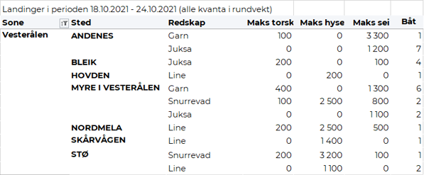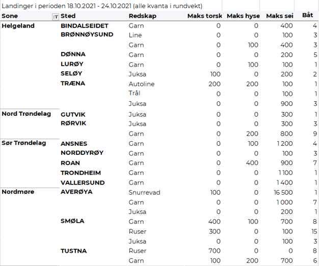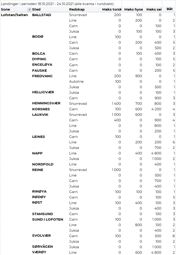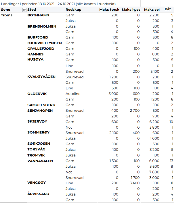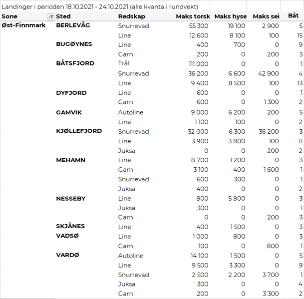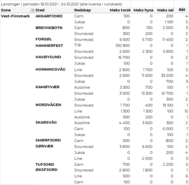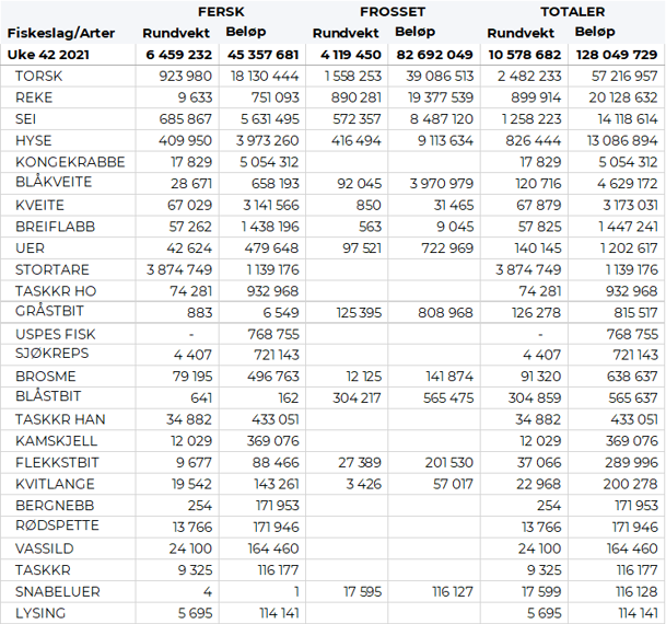 Ser vi på omsetningen av ferskt råstoff totalt for Råfisklagets distrikt, var torsken størst i verdi med 18,1 millioner kroner av et kvantum på 920 tonn. Dette var ned fra 1.030 tonn/20 millioner kroner uka før. Kvantumet i uke 42 var fordelt med 330 tonn tatt på snurrevad, 320 tonn på line/autoline, 210 tonn på trål, og 50 tonn på garn. Den geografiske fordelinga var 640 tonn levert Øst-Finnmark, 220 tonn i Vest-Finnmark, 40 tonn i Troms og for øvrig labert. Av kvantumet levert Øst-Finnmark var 280 tonn tatt på line/autoline, 250 tonn på snurrevad, mens en trålfangst utgjorde 110 tonn. I Vest-Finnmark var redskapsfordelinga 100 tonn på trål, 80 tonn på snurrevad og 30 tonn på line/autoline.