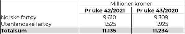Tilsvarende uke i fjor, som var uke 43 (19.-25. oktober 2020) var omsetninga 177 millioner kroner, hvorav 14 millioner kroner kom etter landing fra utenlandske båter. Omsetningen for norske båter var 163 millioner kroner, fordelt med 55 på fersk og 108 på fryst.