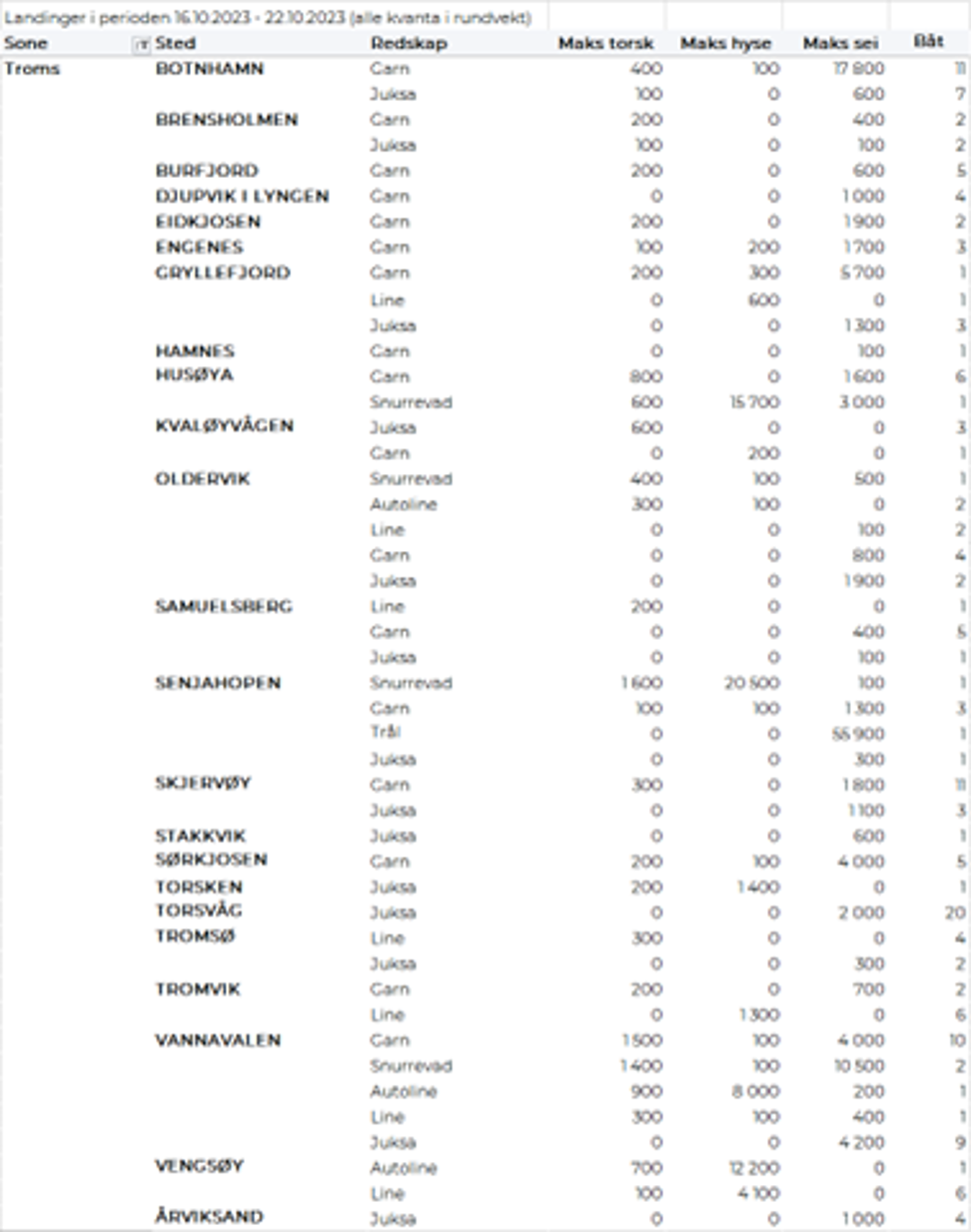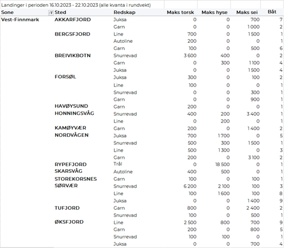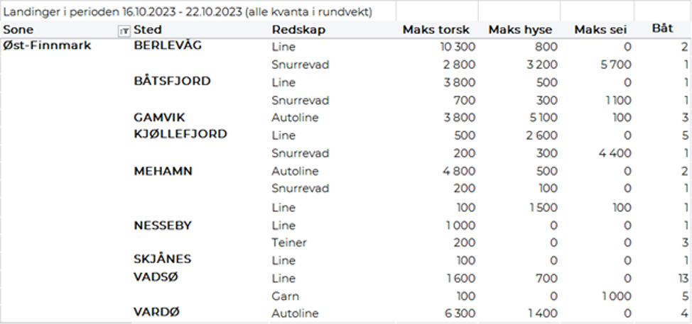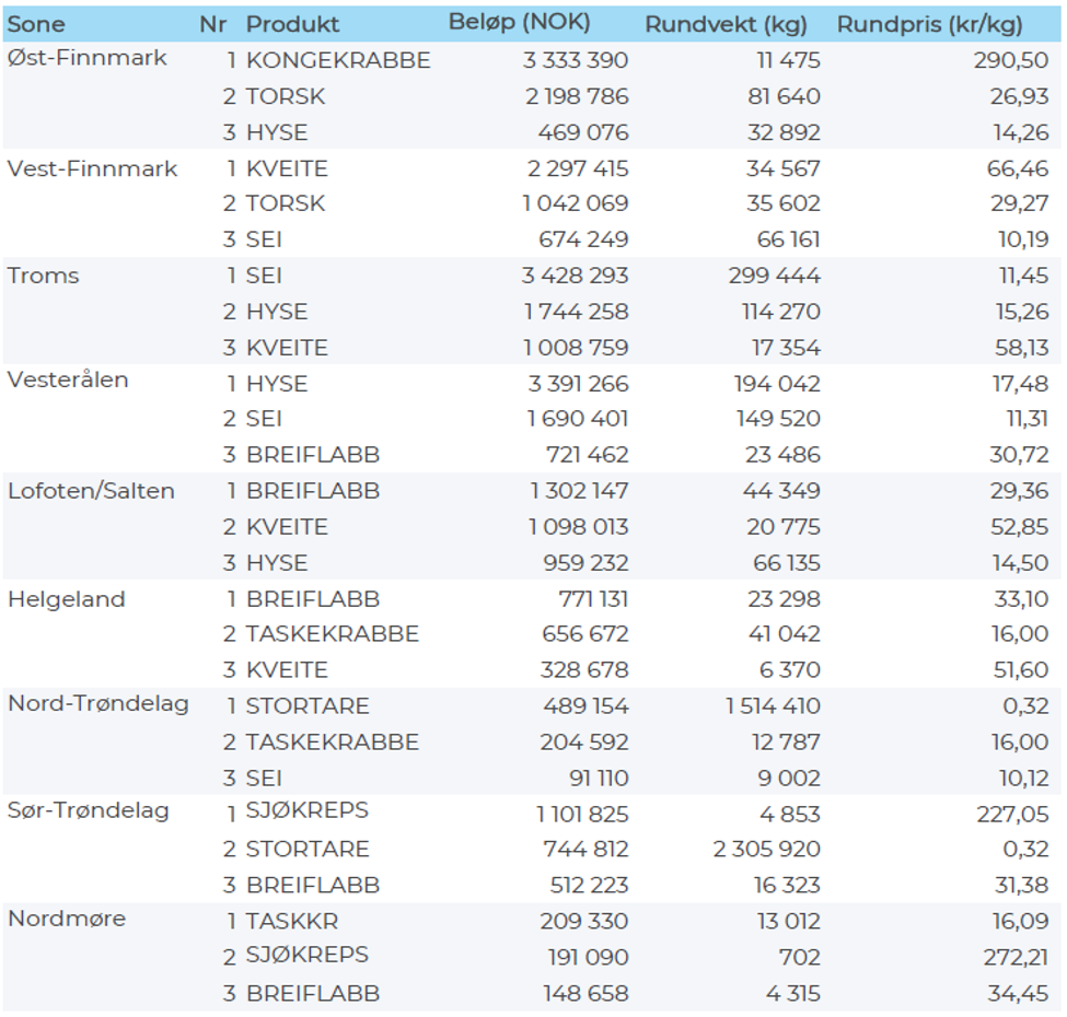 Omsetningen av fersk torsk i uke 42 var på 186 tonn til verdi 5,2 millioner kroner, ned fra 420 tonn og 12,4 millioner kroner uka før. Mest er det levert i Øst-Finnmark som står for 80 tonn av totalen, av det 75 tonn på line/autoline, fulgt av Vest-Finnmark og Troms med 35 tonn på hver.