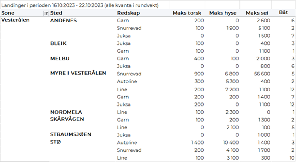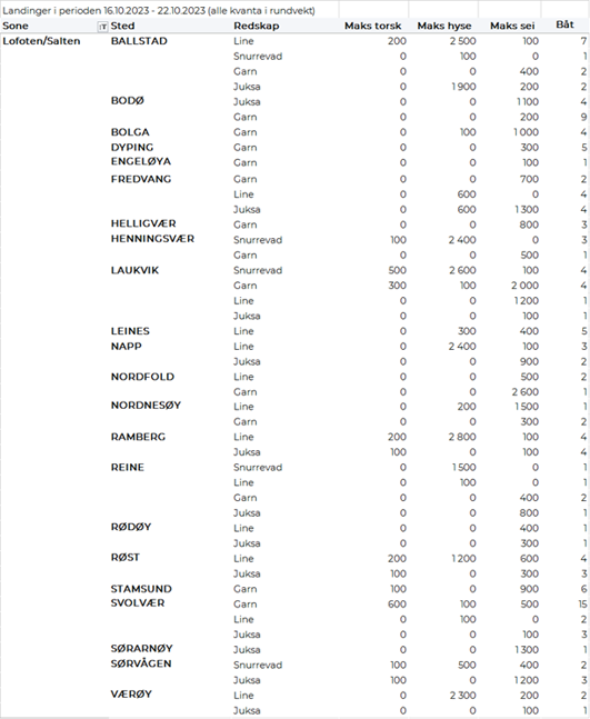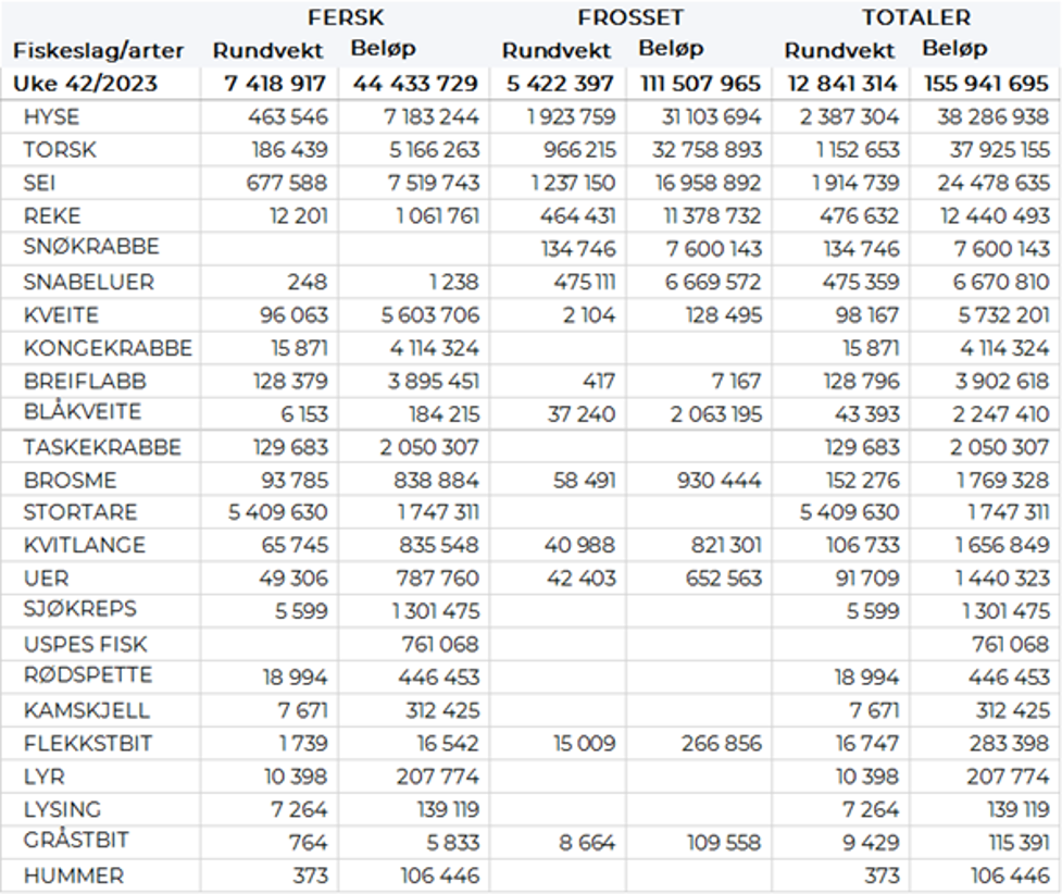 Omsetningen av ferskt råstoff i uke 42 ble på 44 millioner kroner som er bunn-notering så langt i år, ned fra 62 millioner kroner uka før. Seien var størst i verdi med 7,5 millioner kroner, fulgt av hysa som ga en verdi på 7,2 millioner kroner, kveite med 5,6 millioner kroner og vi må helt ned på 4. plassen for å finne torsken med 5,2 millioner kroner. Sistnevnte av et kvantum på beskjedne 186 tonn, som er det laveste ukekvantum fersklevert torsk vi har registrert på «år og dag».