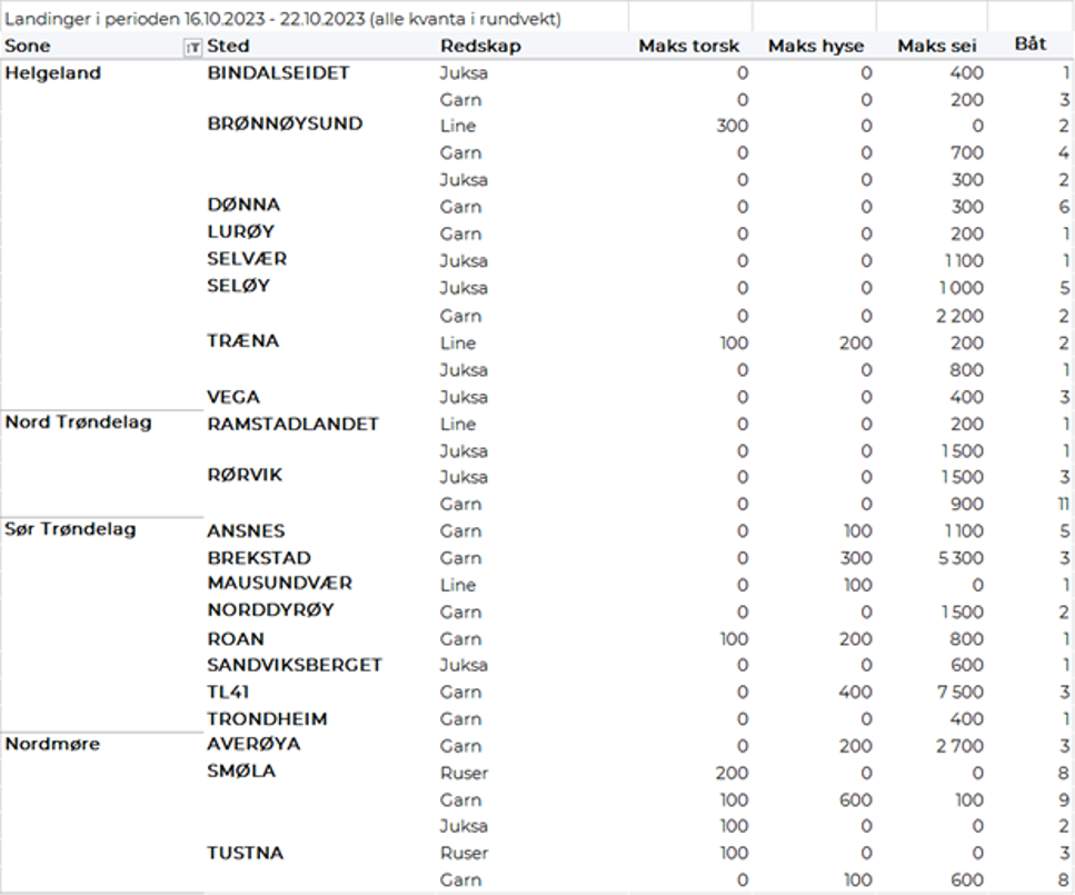 Omsetningen av fersk sei i uke 42 utgjorde 680 tonn til verdi 7,5 millioner kroner, som var ned fra 1.040 tonn/11,0 millioner kroner uken før. Størst kvantum også denne gang levert i Troms med 300 tonn av totalen, fordelt med 130 tonn på garn, 80 tonn på trål og 60 tonn på juksa. Deretter følger Vesterålen med 150 tonn av totalen, hvorav 70 tonn tatt på snurrevad, 40 tonn på garn og 25 tonn på juksa. Neste på lista var Lofoten/Salten med 80 tonn og Vest-Finnmark med 70 tonn.