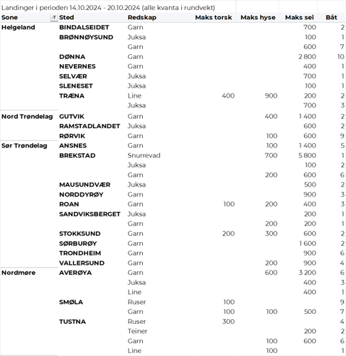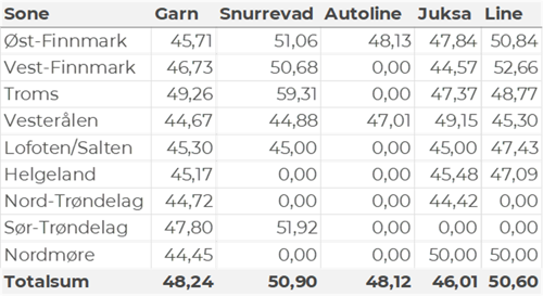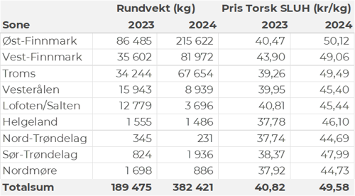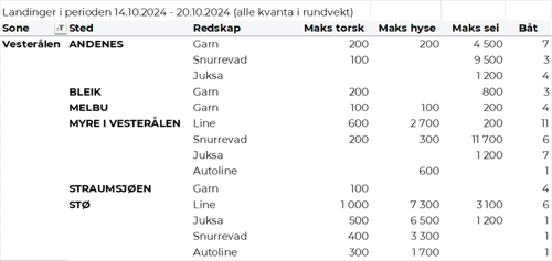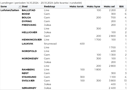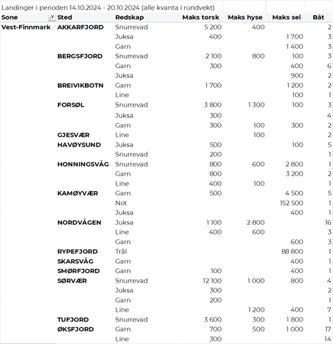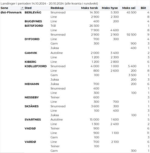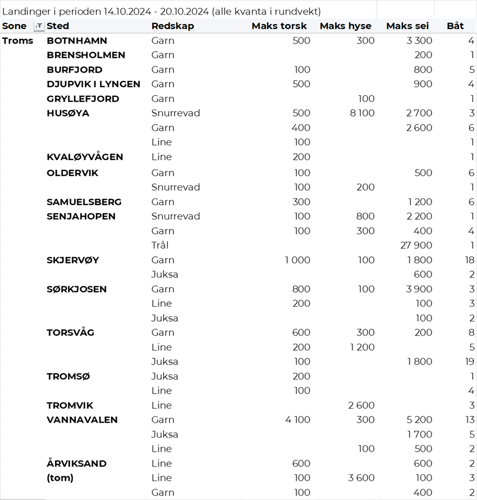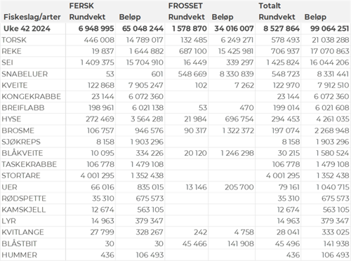 Omsetningen av fersk torsk i uke 42 utgjorde 450 tonn til verdi 14,8 millioner kroner, opp fra 260 tonn og 8,9 millioner kroner uka før. 360 tonn levert i Finnmark, av det 270 tonn i østfylket. Fordelt på redskap var 150 tonn tatt på line/autoline, 120 tonn på snurrevad og 100 tonn på garn.