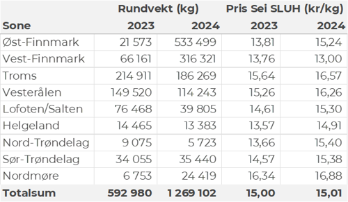 Omsetningen av fersk sei i uke 42 utgjorde 1.410 tonn til en verdi av 15,7 millioner kroner. Opp fra 1.260 tonn/14,8 millioner kroner uken før. 600 tonn var tatt på snurrevad, 340 tonn på garn, 240 tonn på not, 140 tonn på trål og 70 tonn på juksa. 520 tonn av snurrevadkvantumet var levert i Øst-Finnmark, og resterende i hovedsak i Vesterålen. På garn var 140 tonn levert i Troms, ellers spredt. Notkvantumet bestod av 3 leveranser fra en båt i Kamøyvær. Trålkvantumet var levert i Rypefjord og Senjahopen. Juksafisket var mer spredt, men med størst kvantum levert i Torsvåg. Den geografiske fordelingen av seileveransene unntatt trål framgår av tabell 4.