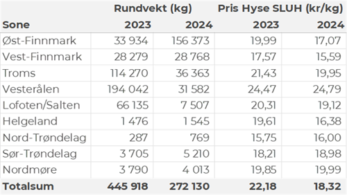 Kvantumet fersklevert hyse i uke 42 var 270 tonn til en verdi av 3,6 millioner kroner. Litt opp fra 250 tonn/3,4 millioner kroner uken før. Størst kvantum er tatt på line/autoline med 170 tonn av totalen, etterfulgt av snurrevad med 60 tonn og garn med 25 tonn. 160 tonn levert i Øst-Finnmark, ellers god geografisk spredning av hyseleveransene, jf. tabell 5.