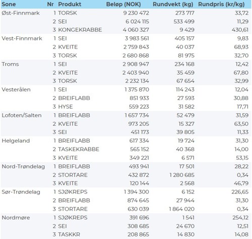 I uke 42 ble det omsatt 23 tonn kongekrabbe til en verdi av 6,1 millioner kroner, som er opp fra 14 tonn/3,9 millioner kroner uken før. Kvantumet var jevnt fordelt på det kvoteregulerte området og utenfor dette området, med leveranser fra henholdsvis 59 og 82 båter. Av totalkvantumet ble 9 tonn tatt i området rundt Magerøya, 4,0 tonn i området mellom Berlevåg og Båtsfjord, 2,7 tonn på Laksefjorden, kvanta fra 2 tonn og lavere i resterende fangstfelt. Så langt i år er det omsatt 1.373 tonn kongekrabbe til en verdi av 396 millioner kroner, fordelt med 737 tonn/303 millioner fra regulert fiskeri og 625 tonn/89 millioner kroner fra uregulert fisker. Til sammenligning var det til samme tid i 2023 omsatt 2.409 tonn kongekrabbe til en verdi av 676 millioner kroner, fordelt med 1.975 tonn/614 millioner kroner fra regulert fiskeri og 422 tonn/57 millioner kroner fra uregulert fiskeri.