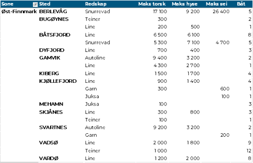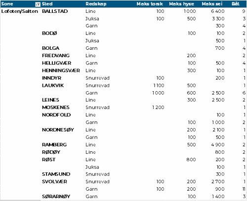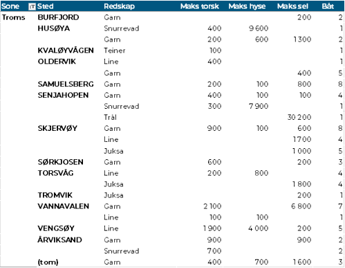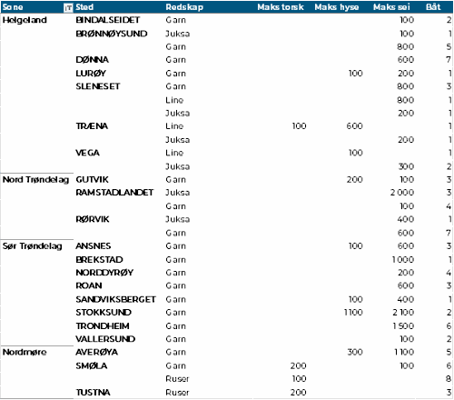 Tabell 2 og 3 viser fordelingen av landingene av fersk torsk per leveringssone og redskap (unntatt trål), med tilhørende snittpriser. De to tabellene er basert på omsetning av kvalitet A og ekstra, der alle leveringstilstander inngår, men der snittprisene er omregnet til sløyd uten hode-priser, eksklusivt restråstoff.