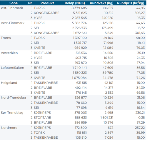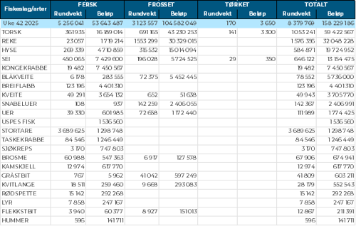 Omsetningen av ferskt råstoff i uke 42 utgjorde 54 millioner kroner, som var ned fra 63 millioner kroner uken før. Det meste av dette var torsk, kongekrabbe, sei, hyse, breiflabb og kveite, som sto for henholdsvis 16, 7, 7, 5, 4 og 4 millioner kroner. Omsetning for disse og resterende arter fremkommer av tabell 1.