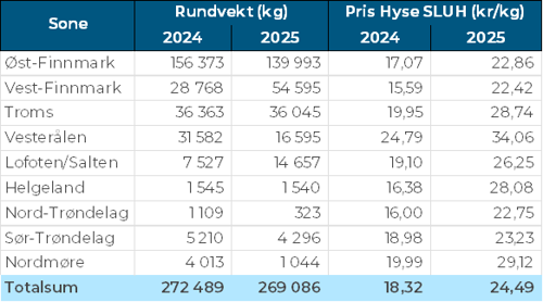 Hittil i år er det omsatt 1.207 tonn kveite til en verdi på 84 millioner kroner, mot 2.082 tonn / 127 millioner kroner i 2024 i samme periode. Gjennomsnittsprisen for rund kveite hittil i år ligger på 69,85 kr/kg, opp 9 kr/kg fra samme periode i fjor.