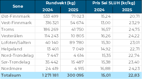Omsetningen av fersk sei i uke 42 utgjorde 450 tonn til en verdi av 7 millioner kroner, ned fra 580 tonn/9 millioner kroner i uke 41. Kvanta per leveringssone (unntatt trål) fremgår av tabell 4. Redskapsfordelingen var 150 tonn på trål, 120 tonn på garn, 80 tonn snurrevad, 60 tonn på line/autoline og 40 tonn på juksa. Sammenlignet med uka før var det økte landinger fra trål og lina, jevnt for juksa, og reduksjon på snurrevad og garn, samt at det ikke var levert notfanget sei i uke 42 mot 130 tonn uka før. Geografisk var størst kvantum levert i Vest-Finnmark med 170 tonn, ellers var 70-90 tonn fordelt på hver av Lofoten/Salten, Troms og Øst-Finnmark, og mindre enn 15 tonn i øvrige leveringssoner. Trålkvantumet var fordelt på 3 fangster, to til Rypefjord og en til Senjahopen. Garn- og juksaseien var mer spredt fordelt, mens snurrevadseien i hovedsak var levert i Øst-Finnmark (70 tonn). Det meste av lineseien var levert i Lofoten/Salten.