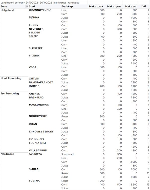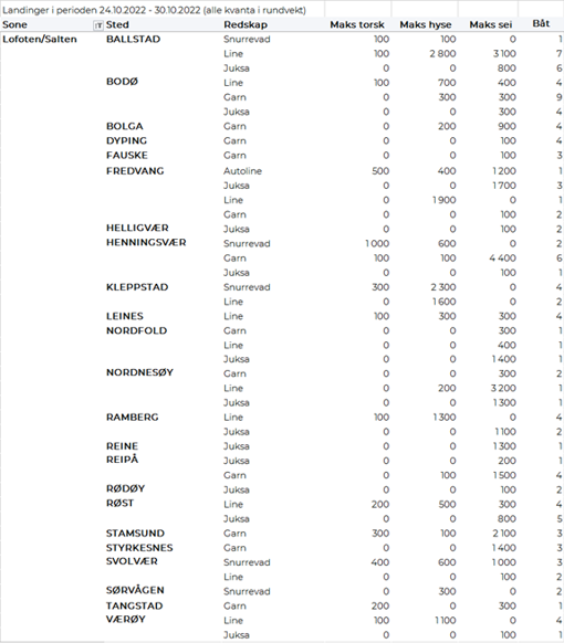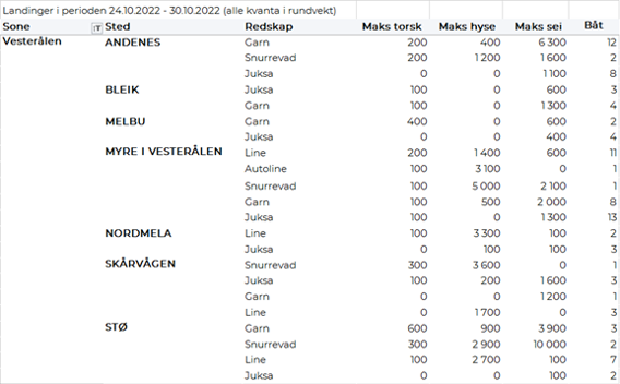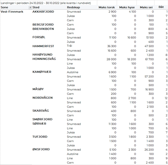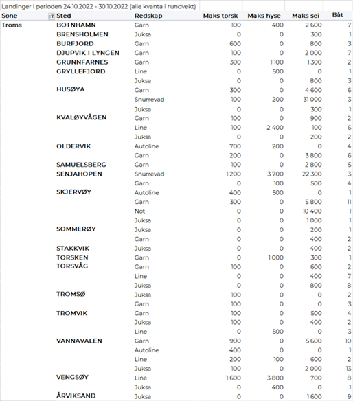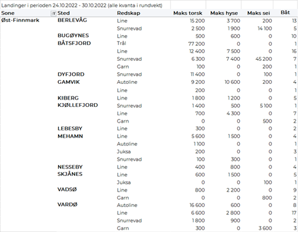 Omsetningen av fersk torsk utgjorde 960 tonn til verdi 23 millioner kroner, opp fra 830 tonn og 21 millioner kroner uken før. Line/autoline stod for 540 tonn, 250 tonn var tatt på snurrevad, 110 tonn på trål og 40 tonn på garn. Så og si all linetorsken var levert i Øst-Finnmark, mens snurrevadtorsken var fordelt med 70 tonn på Øst- og 170 tonn på Vest-Finnmark. Tråltorsken var fra en leveranse i Båtsfjord og en i Hammerfest. Av totalt 960 tonn var 650 tonn levert i Øst-Finnmark og 240 tonn i Vest-Finnmark.