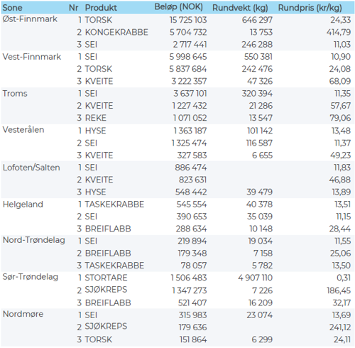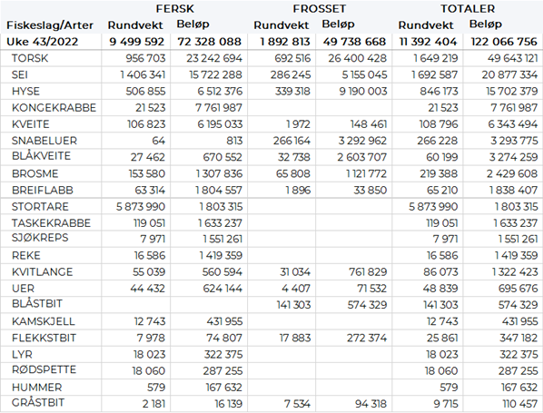 Omsetningen av ferskt råstoff i uke 43 utgjorde 72 millioner kroner, opp fra 67 millioner kroner uka før. Torsk, sei og kongekrabbe var størst i verdi med 8-23 millioner kroner på hver, og for øvrig slik det framgår av tabell 2.