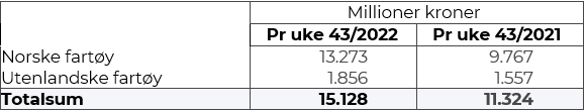 Totalomsetningen hittil i år sammenlignet med tilsvarende periode i fjor framgår av tabell 1. Den økte omsetningen for norske båter er på 3,5 milliarder kroner, fordelt med pluss på 2,4 på fersk- og 1,1 på frystomsetningen. Frystomsetningen pr uke 43 i år er på 5.538 millioner kroner, mens ferskomsetningen er oppe i 7.724 millioner kroner. En stor del av den økte frystomsetningen skriver seg fra sluttspurten i 2021 der kvantumet er omsatt på begynnelsen av 2022. Men økt omsetning av fryst råstoff også i uke 6, da foreløpig ukerekord ble satt med 275 millioner kroner, en rekord som ble slått i uke 12 da med 290 millioner kroner. Omsetningen av fryst torsk pr uke 43 i år er på 2.512 millioner kroner mot 1.653 millioner kroner til samme tid i fjor, av kvantum på henholdsvis 79.670 og 77.240 tonn. Når det gjelder omsetningen av fersklevert råstoff, drar torsken opp pga. økte priser til tross for redusert kvantum. Kvantum fersk torsk omsatt så langt er 199.930 tonn, mot 207.570 tonn til samme tid i fjor, mens verdien er opp fra 3.362 til 4.881 millioner kroner.