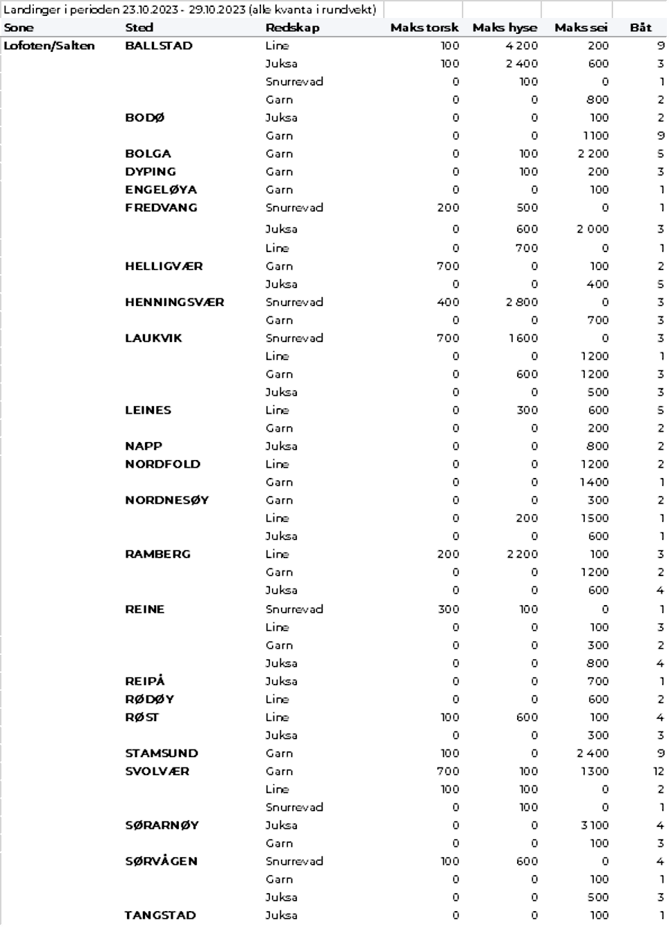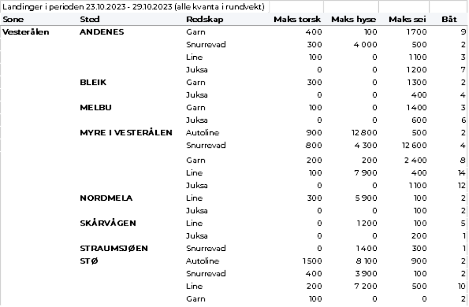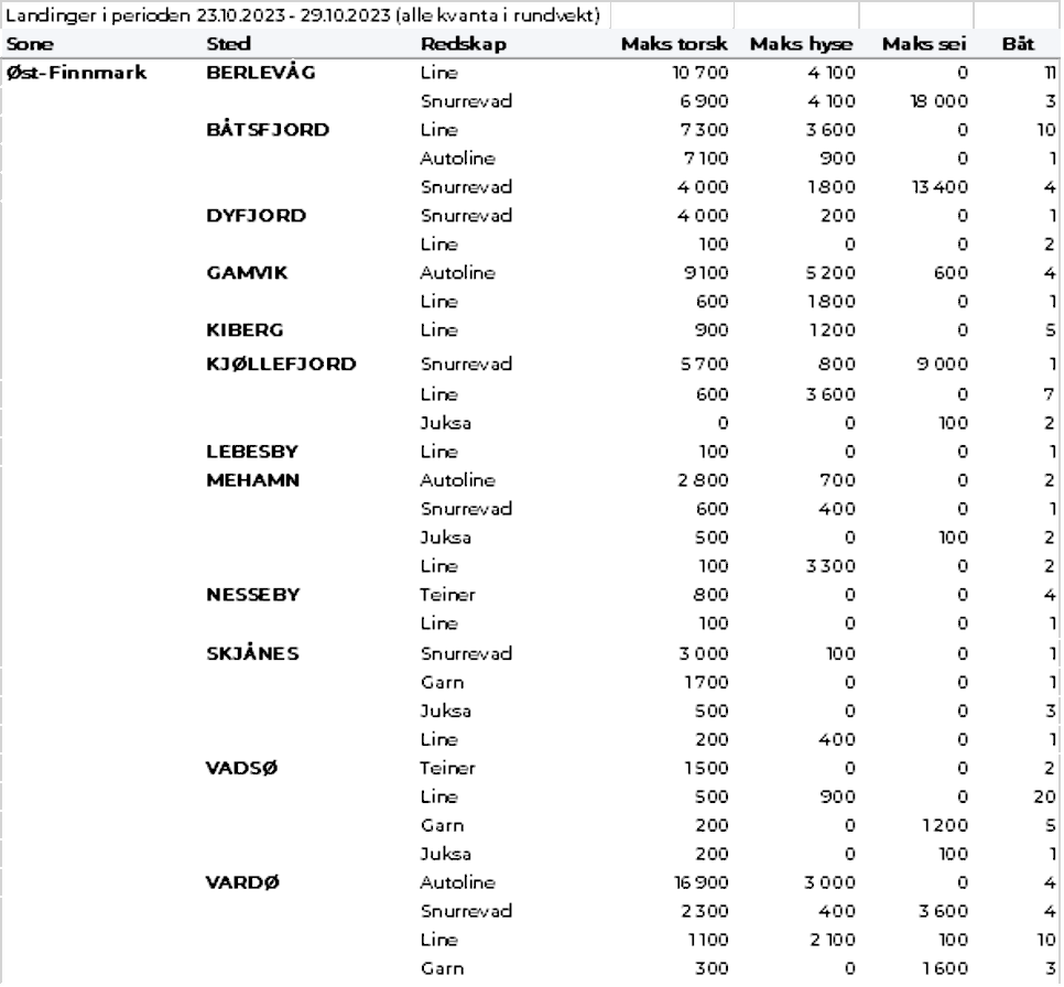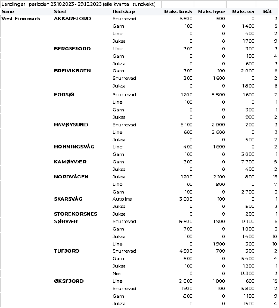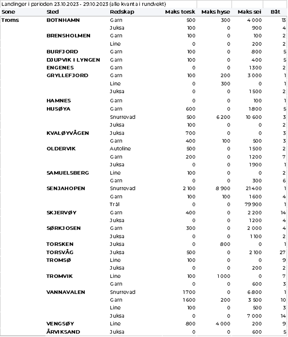 Omsetningen av fersk torsk i uke 44 var på 570 tonn til verdi 16 millioner kroner, opp fra 192 tonn og 5,6 millioner kroner uka før. Mest er det levert i Øst-Finnmark som står for 330 tonn av totalen, av det 260 tonn på line/autoline og 50 tonn på snurrevad, fulgt av Vest-Finnmark med 150 tonn og Troms med 40 tonn.