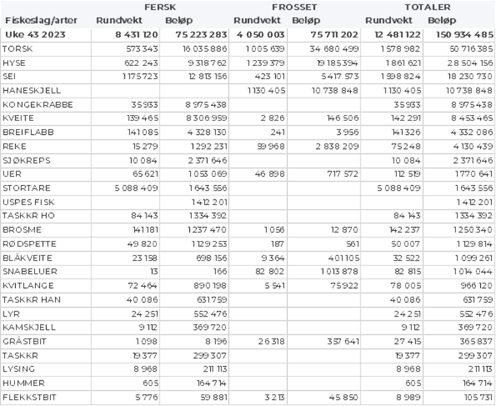 Omsetningen av ferskt råstoff i uke 43 ble på 75 millioner kroner, opp fra 45 millioner kroner uka før som var bunn-nivå på ferskomsetninga så langt i år. Torsken var størst i verdi med 16 millioner kroner, fulgt av seien som ga en verdi på 13 millioner kroner, hysa og kongekrabben med 9 millioner kroner på hver og kveita med 8 millioner kroner.