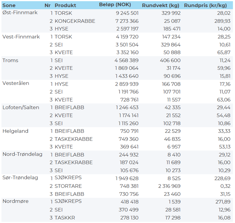 Omsetningen av fersk kveite i uke 43 utgjorde 139 tonn til en verdi av 8,3 millioner kroner, som er bestenotering for året, opp fra 96 tonn/5,6 millioner kroner uken før. Av totalen ble 79 tonn tatt på line/autoline og 56 tonn på garn. Fordelt per leveringssone er det levert mest i Vest-Finnmark med 54 tonn, videre 33 tonn i Troms og 23 tonn i Lofoten/Salten, og kvanta under 12 tonn i resterende soner.