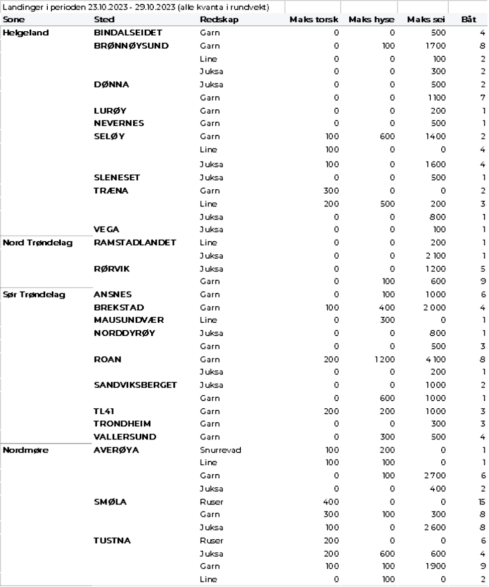 Omsetningen av fersk sei i uke 43 utgjorde 1.180 tonn til verdi 13 millioner kroner, som var opp fra 680 tonn/7,5 millioner kroner uken før. Størst kvantum også denne gang levert i Troms med 410 tonn av totalen, fordelt med 140 tonn på juksa, 125 tonn på garn, 80 tonn på trål og 60 tonn på snurrevad. Deretter følger Vest-Finnmark med 330 tonn av totalen, hvorav 175 tonn tatt på garn, 60 tonn på snurrevad, 70 tonn på juksa og 20 tonn på not. Neste på lista var Øst-Finnmark med 130 tonn og Vesterålen og Lofoten/Salten med vel 100 tonn på hver. Også noe sei på garn og juksa fra Helgeland til Nordmøre, med totalt 100 tonn levert på den strekninga.