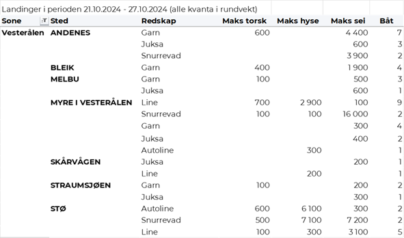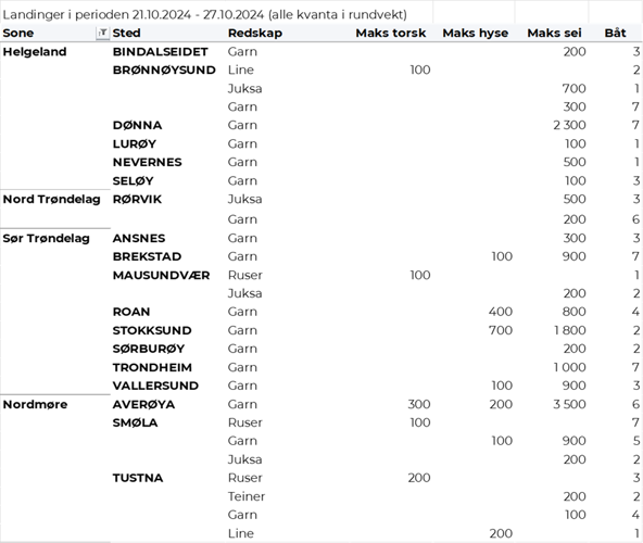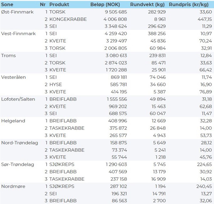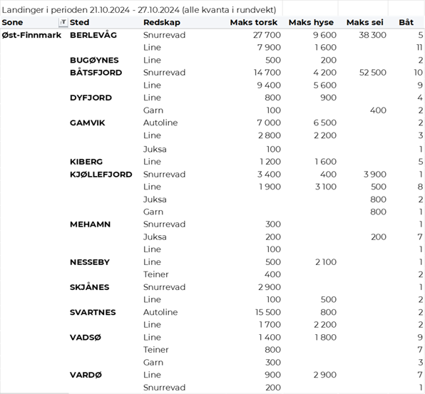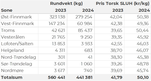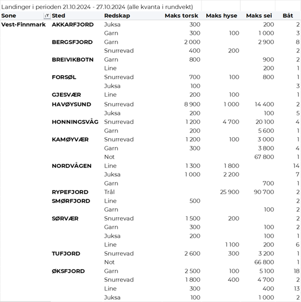 Omsetningen av fersk torsk i uke 43 utgjorde 452 tonn til en verdi av 15 millioner kroner, tilnærmet likt som uken før når omsetningen var 450 tonn/ 14,8 millioner kroner. Det meste er levert i Øst-Finnmark som står for 283 tonn av totalen, hvorav 167 tonn kom fra line/autoline og 109 tonn fra snurrevad. Deretter følger Troms med 86 tonn av totalen, hvorav 80 tonn kom fra garn. Vest-Finnmark er neste på listen med 65 tonn, hvorav 28 tonn kom fra snurrevad og 24 tonn kom fra garn. Kvanta under 10 tonn per sone for resterende.