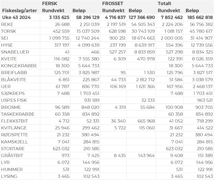 Omsetningen av ferskt råstoff i uke 43 utgjorde 58 millioner kroner, ned fra 65 millioner kroner uken før. Torsk, sei, kveite, kongekrabbe og hyse stod for det meste av ferskomsetningen, jf. tabell 1.