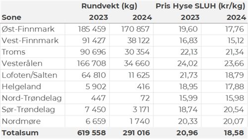Kvantumet fersklevert hyse i uke 43 var 317 tonn til verdi 4,0 millioner kroner. En økning fra uken før når det var omsatt 270 tonn/ 3,6 millioner kroner. Det meste tas på line/autoline som står for 194 tonn av totalen. Etterfulgt av 71 tonn på snurrevad og 26 tonn fra trål. Sistnevnte levert Rypefjord. Det meste leveres i Øst-Finnmark som står for 171 tonn av totalen, deretter følger Vest-Finnmark med 64 tonn, 34 tonn i Vesterålen og 30 tonn i Troms. Kvanta fra 12 tonn og lavere per sone for resterende.