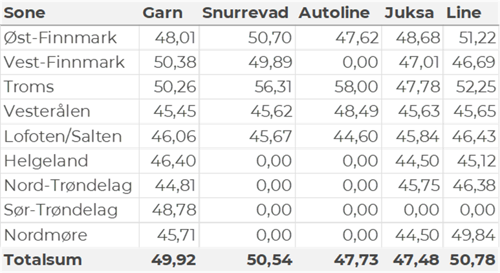 Tabell 2 og 3 viser fordelingen av landingene av fersk torsk pr leveringssone og redskap (unntatt trål), med tilhørende snittpriser. De to tabellene er basert på omsetning av kvalitet A og ekstra, der alle leveringstilstander inngår, men der snittprisene er omregnet til sløyd uten hode-priser, eksklusiv restråstoff.