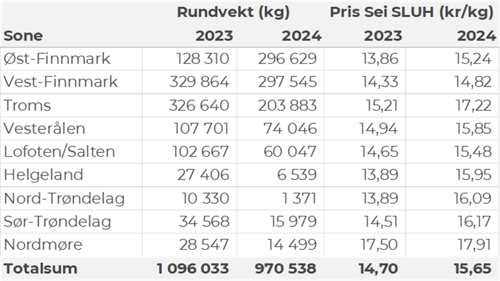 Omsetningen av fersk sei i uke 43 utgjorde 1.100 tonn til en verdi av 12,7 millioner kroner. En nedgang fra 1.410 tonn/ 15,7 millioner kroner uken før. Vest-Finnmark er største sone med 388 tonn av totalen, etterfulgt av Øst-Finnmark med 296 tonn, 240 tonn i Troms, 73 tonn i Vesterålen og 62 tonn i Lofoten. Kvanta fra 17 tonn og lavere per sone for resterende. Fordelt per redskap var snurrevad størst med 449 tonn av totalen, etterfulgt av garn med 302 tonn, 160 tonn på not, 126 tonn på trål, 42 tonn på line/autoline og 20 tonn på juksa. Notkvantumet fordeler seg med 93 tonn levert Kamøyvær og 67 tonn til Tufjorden. Trålkvantumet fordeler seg med 91 tonn levert Rypefjorden og 36 tonn til Senjahopen.