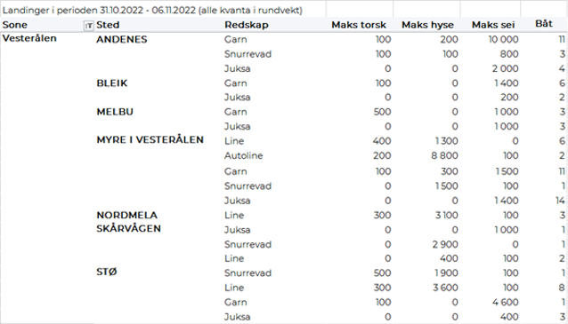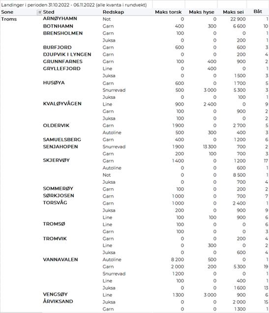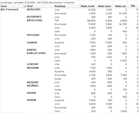 Omsetningen av fersk torsk utgjorde 1.160 tonn til verdi 29 millioner kroner, opp fra 970 tonn og 24 millioner kroner uken før. Line/autoline stod for 540 tonn, 270 tonn var tatt på snurrevad, 230 tonn på trål og 110 tonn på garn. Så og si all linetorsken var levert i Øst-Finnmark, mens snurrevadtorsken var fordelt med 75 tonn på Øst- og 180 tonn på Vest-Finnmark. Tråltorsken var fra 2 leveranser i Båtsfjord. Av totalt 1.160 tonn var 800 tonn levert i Øst-Finnmark, 230 tonn i Vest-Finnmark og 90 tonn i Troms.