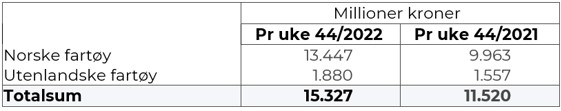 Tabell 2: Omsetning for norske båter i uke 44, 2022, fordelt pr fersk/fryst og pr fiskeslag.