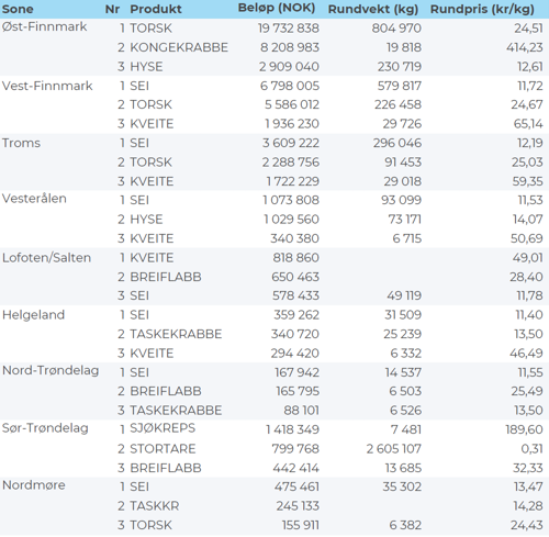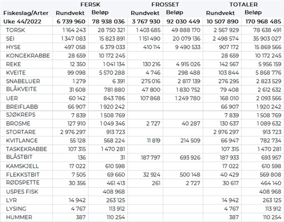 Omsetningen av ferskt råstoff i uke 44 utgjorde 79 millioner kroner, opp fra 73 millioner kroner uka før. Torsk, sei og kongekrabbe var størst i verdi med 10-29 millioner kroner på hver, og for øvrig slik det framgår av tabell 2.