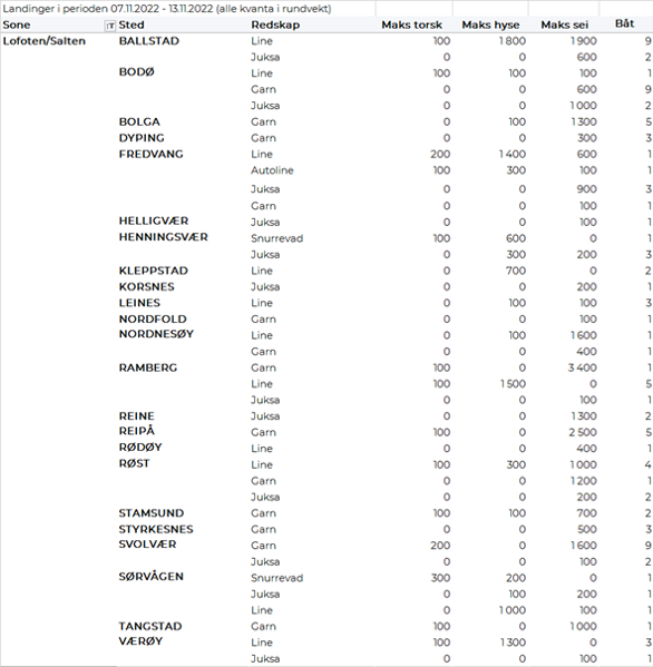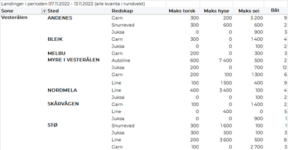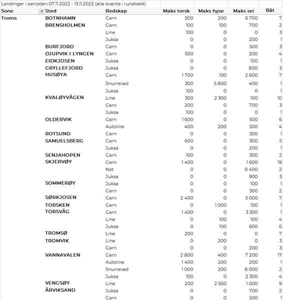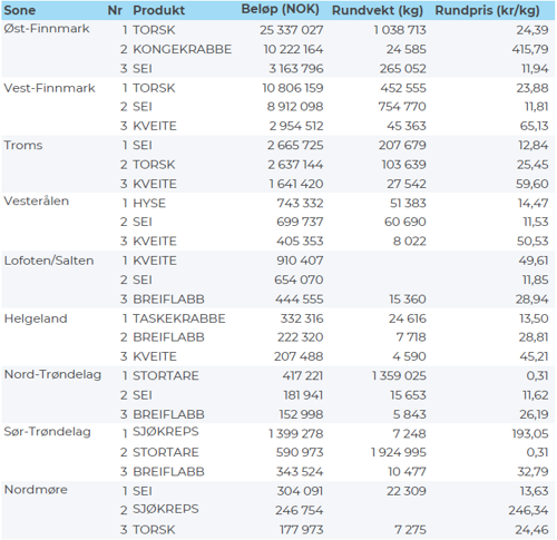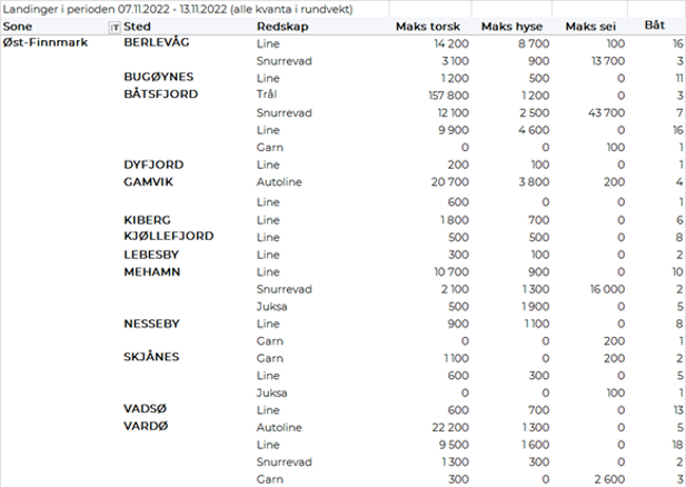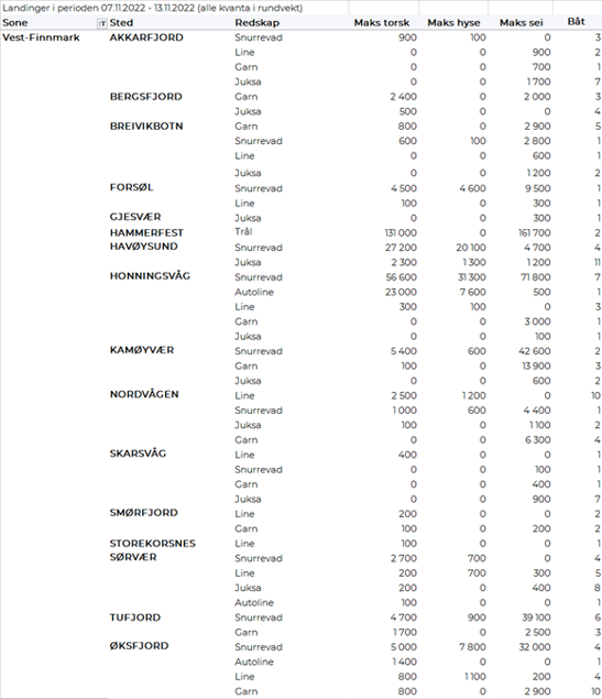 Omsetningen av fersk torsk utgjorde 1.640 tonn til verdi 40 millioner kroner, opp fra 1.160 tonn og 29 millioner kroner uken før. Line/autoline stod for 590 tonn, 570 tonn var tatt på trål, 320 tonn på snurrevad og 140 tonn på garn. 530 tonn av linetorsken var levert i Øst-Finnmark. Tråltorsken var fra 4 kombifangster fersk/fryst, det meste levert i Båtsfjord. Av de 320 tonnene fra snurrevad var 240 tonn levert i Vest-Finnmark og 80 tonn i Øst-Finnmark. Av totalt 1.640 tonn var dermed 1.040 tonn levert i Øst-Finnmark, 450 tonn i Vest-Finnmark og 110 tonn i Troms.