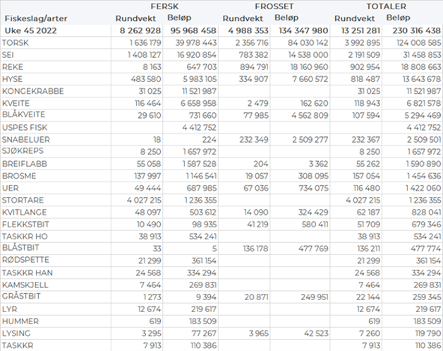 Omsetningen av ferskt råstoff i uke 45 utgjorde 96 millioner kroner, opp fra 80 millioner kroner uka før. Torsk, sei og kongekrabbe var størst i verdi med 11-40 millioner kroner på hver, og for øvrig slik det framgår av tabell 2.