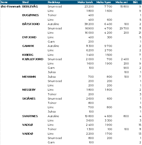 Omsetningen av fersk torsk i uke 45 kom på 1.100 tonn til en verdi av 52 millioner kroner, opp fra forrige ukes 790 tonn /37 millioner kroner. Av kvantumet i uke 45 var 390 tonn tatt på garn, 360 tonn på line/autoline, 320 tonn på snurrevad og mindre kvanta på juksa, trål og teiner. Det meste av linekvantumet, 300 tonn, var levert i Øst-Finnmark, mens garnkvantumet i hovedsak var levert i Vest-Finnmark (220 tonn) og Troms (150 tonn). Snurrevadkvantumet var i hovedsak levert i Øst-Finnmark med 175 tonn og Vest-Finnmark med 120 tonn. Av totalen ble 890 tonn levert i Finnmark, 490 tonn i Øst- og 400 tonn i Vest-Finnmark. 180 tonn var levert i Troms og ellers spredt. Økte landinger fra både garn, line og snurrevad, og geografisk var det størst øking i Øst-Finnmark.