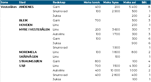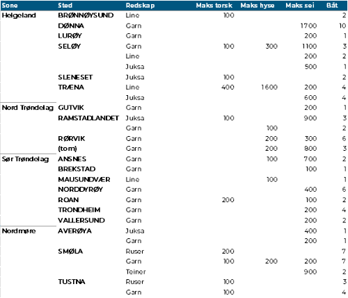 Tabell 2 og 3 viser fordelingen av landingene av fersk torsk per leveringssone og redskap (unntatt trål), med tilhørende snittpriser. De to tabellene er basert på omsetning av kvalitet A og ekstra, der alle leveringstilstander inngår, men der snittprisene er omregnet til sløyd uten hode-priser, eksklusivt restråstoff.