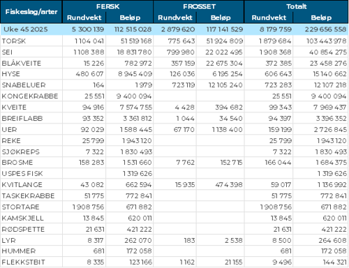 Omsetningen av ferskt råstoff i uke 45 utgjorde 113 millioner kroner, som var opp fra 100 millioner kroner uken før. Det meste av dette var torsk, sei, kongekrabbe, hyse, kveite og breiflabb, som sto for henholdsvis 52, 19, 10, 9, 9, 8 og 3 millioner kroner. Omsetning for disse og resterende arter fremkommer av tabell 1.
