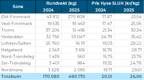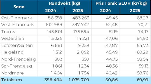 Hittil i år er det omsatt 1.475 tonn fersk kveite til en verdi på 106 millioner kroner, mot 2.396 tonn / 147 millioner kroner for samme periode i 2024. Gjennomsnittsprisen for rund kveite hittil i år ligger på 71,55 kr/kg, opp 10,02 kr/kg fra samme periode i fjor.